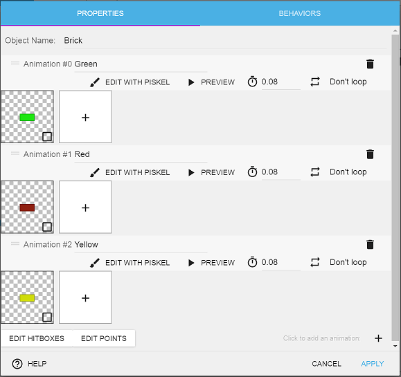 • Name this object Brick. Give it three separate animations using the brick-green.png, brick-red.png and brick-yellow.png files from your project folder. Name the animations accordingly.